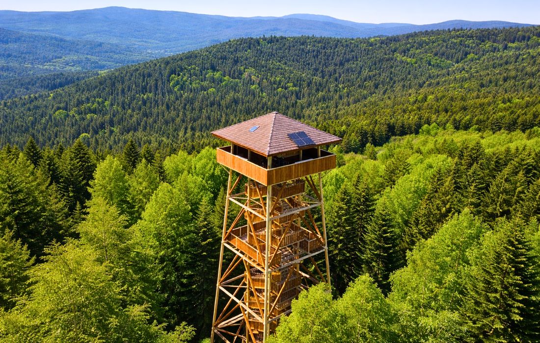 Wśród lasów pasma Jaworzyny Krynickiej powstała pierwsza w Polsce wieża widokowa w koronach drzew o unikalnej konstrukcji drewnianej. Aby dotrzeć pieszo na na wieżę, masz do wyboru kilka malowniczych tras o różnym stopniu trudności. Jeśli nie chcesz iść pieszo, możesz skorzystać z 6-osobowej kolejki krzesełkowej. Do wieży prowadzi ścieżka w koronach drzew. To ponad kilometr drewnianych pomostów i platform zawieszonych na wysokości kilku metrów nad ziemią, które prowadzą przez las. Spacerując tą ścieżką, możesz obserwować przyrodę z zupełnie nowej perspektywy — z poziomu koron drzew.